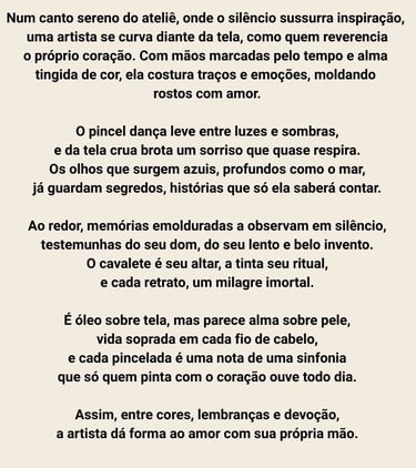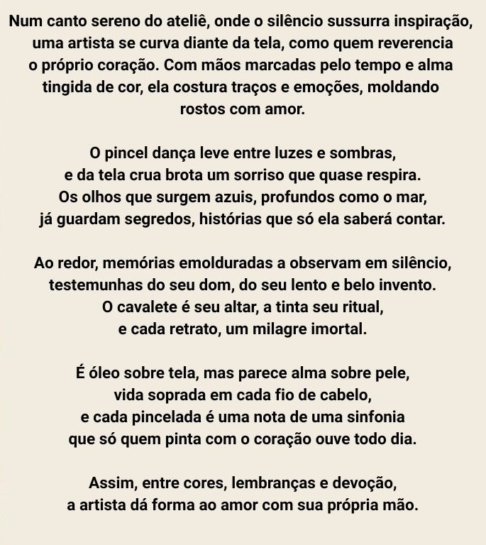 Sou uma artista apaixonada por pinturas em óleo sobre tela, criando obras que expressam emoções e beleza. Explore meu portfólio e descubra a arte que ressoa com você.